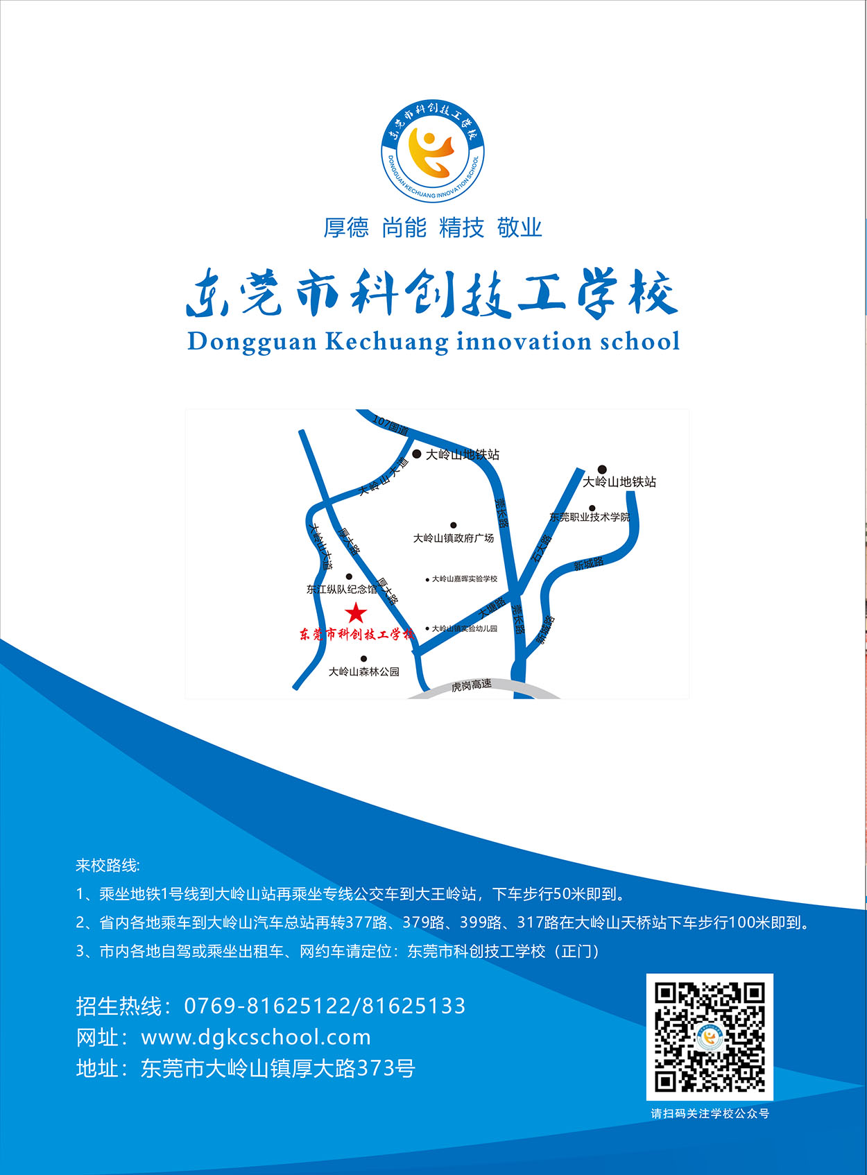 地 址:东莞市大岭山镇厚大路光泰园区科创技工学校招生办公室
